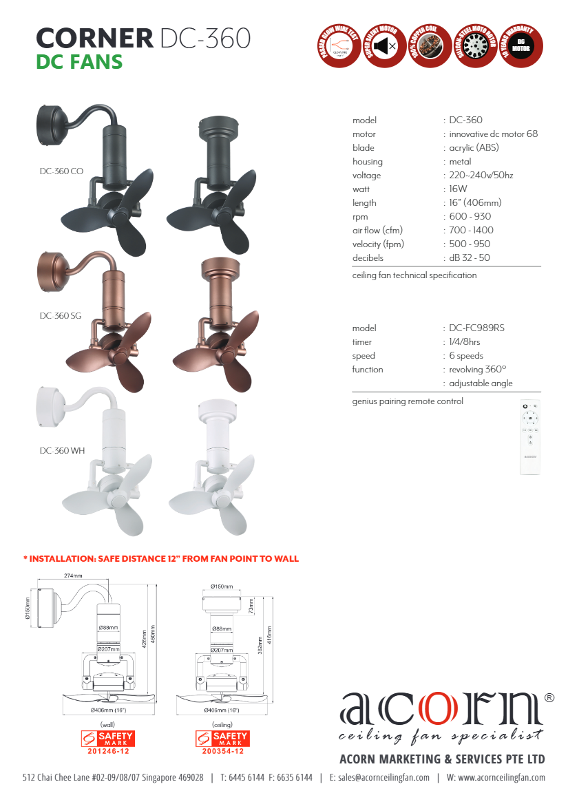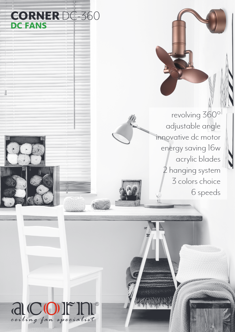 Acorn DC360 16" Smart Corner Fan with 360-Degree Oscillation + Remote Control (Hugger Ceiling Mounted/ Wall Mounted)