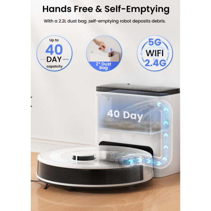 Automatic dust collection system keeps cleaning hands-free for up to 40 days.