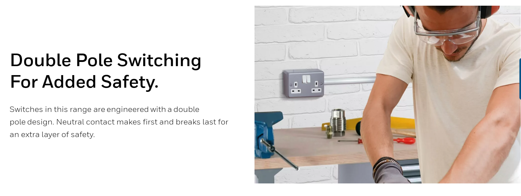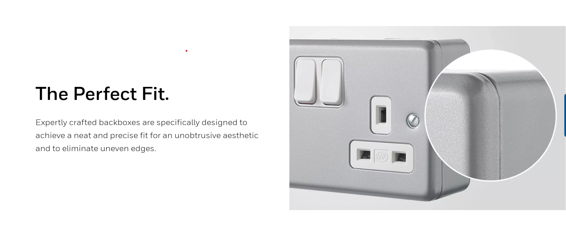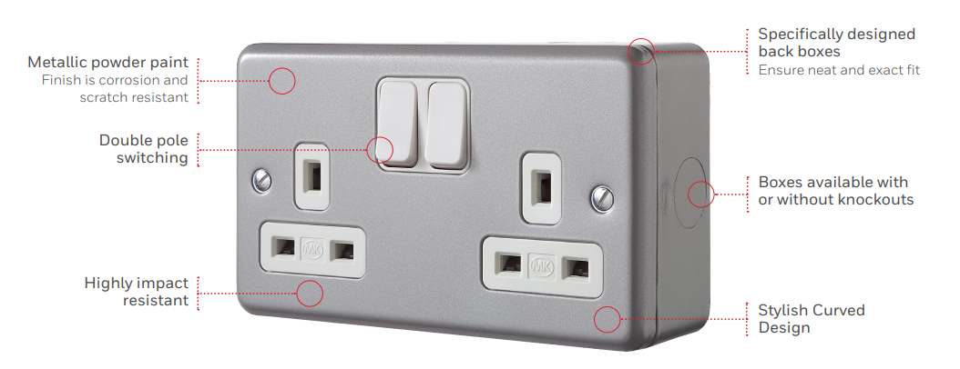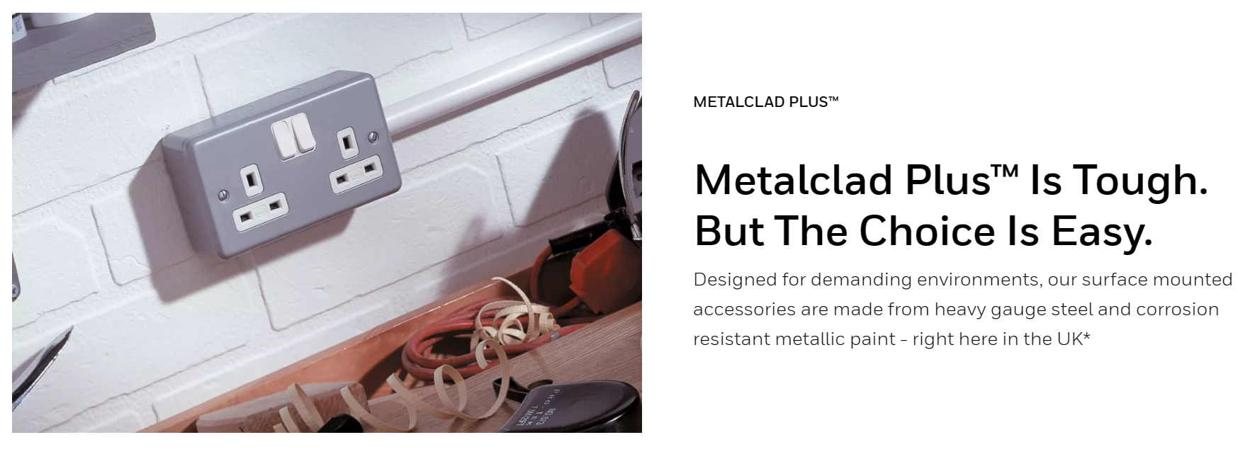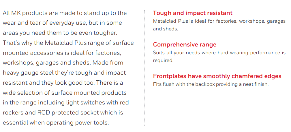 All MK products are made to stand up to the wear and tear of everyday use, but in some areas, you need them to be even tougher. That’s why the Metalclad Plus range of surface mounted accessories is ideal for factories, workshops, garages and sheds. Made from heavy gauge steel they’re tough and impact resistant and they look good too. There is a wide selection of surface mounted products in the range including light switches with red rockers and RCD protected socket which is essential when operating power tools.