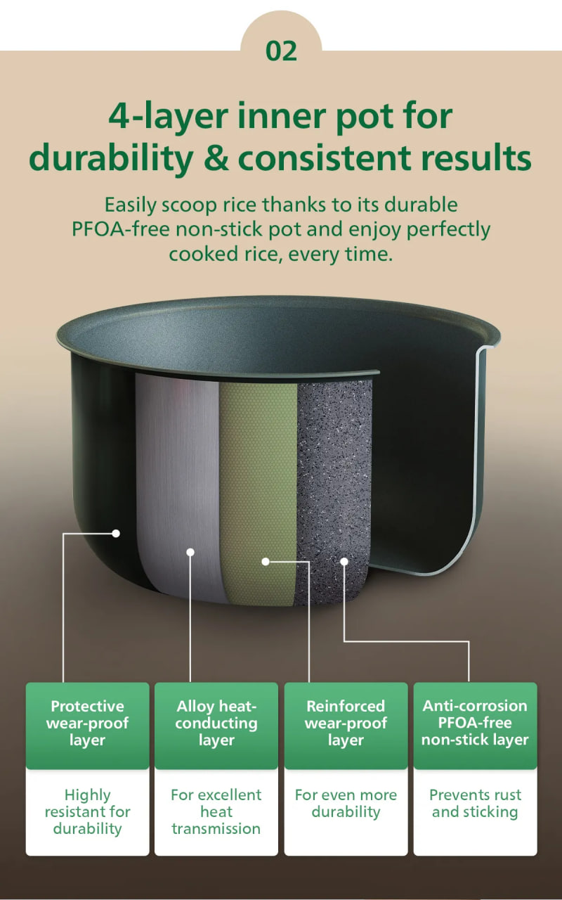 4 layers inner pot with anti-stick coating to stable even heat yet non-sticky enablement